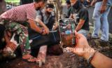 Petugas panitia mengambil video yang disiarkan langsung secara daring saat pemotongan hewan kurban Idul Adha 1442 Hijriyah di Mitra Tani (MT) Farm, Desa Tegalwaru, Ciampea, Kabupaten Bogor, Jawa Barat, Selasa (20/7/2021). Pemotongan hewan kurban secara daring tersebut sesuai surat edaran MUI Kabupaten Bogor untuk menghindari kerumunan warga dan daging hewan kurban didistribusikan oleh petugas ke tempat tinggal warga yang berhak menerima. (FOTO : ANTARA/Arif Firmansyah)