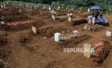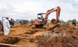 Petugas di lokasi pemakaman pekuburan COVID-19, Buper Waena, Kota Jayapura, Papua, Selasa (20/7/2021). Data pihak berwenang setempat per 17 Maret - 18 Juli 2021 menyebut dari 45 rumah sakit (RS) Pemerintah dan 16 Swasta di Papua total kasus meninggal dunia akibat COVID-19 berjumlah 634 orang dan Kota Jayapura masuk Zona Merah untuk kematian akibat COVID-19. (FOTO : ANTARA FOTO/Indrayadi TH)