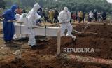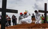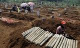 Petugas pemakaman membawa peti jenazah korban COVID-19 untuk dikuburkan di pemakaman khusus COVID-19 TPU Pondok Rajeg, Kabupaten Bogor, Jawa Barat, Selasa (20/7/2021). Pada periode tanggal 18-19 Juli angka kematian akibat COVID-19 kembali berada di titik tertinggi selama pandemi, Pemerintah mencatat sebanyak 1.338 pasien meninggal dunia. Dengan jumlah kematian tersebut saat ini sebanyak 74.920 pasien telah meninggal sejak pertama kali penularan terjadi 2 Maret 2020. (FOTO : ANTARA FOTO/Yulius Satria Wijaya)