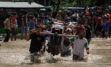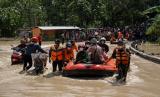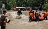 REPUBLIKA.CO.ID, CILACAP -- Petugas SAR gabungan menyeberangkan warga menggunakan perahu karet di ruas jalan nasional Jeruklegi-Kawunganten, yang terputus akibat banjir di Desa Jeruklegi Wetan, Jeruklegi, Cilacap, Jawa Tengah, Rabu (21/7).