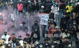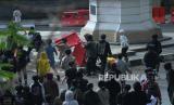 Sejumlah peserta aksi melakukan perusakan pembatas jalan saat aksi menolak Pemberlakuan Pembatasan Kegiatan Masyarakat (PPKM) oleh massa gabungan pelajar, mahasiswa, pedagang dan ojol di Kawasan Balai Kota, Jalan Wastukancana, Kota Bandung, Rabu (21/7). Mereka berharap pemerintah segera menghentikan PPKM, karena kebijakan tersebut dianggap telah menyengsarakan rakyat. (FOTO : Edi Yusuf/Republika)