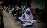 Pelajar mengantre untuk mendapatkan vaksin Covid-19 di SMAN 113 Jakarta di kawasan Lubang Buaya, Jakarta Timur, Kamis (22/7). Vaksinasi Covid-19 tersebut diperuntukan bagi kalangan pelajar dengan usia 12-17 tahun di wilayah Lubang Buaya, Jakarta Timur, dengan target vaksinasi sebanyak 1.000 orang guna menciptakan kekebalan kelompok sebagai antisipasi penyebaran Covid-19. Republika/Thoudy Badai (FOTO : Republika/Thoudy Badai)