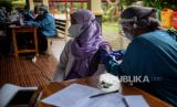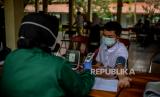 Tenaga kesehatan memeriksa tekanan darah pelajar sebelum disuntik vaksin Covid-19 di SMAN 113 Jakarta di kawasan Lubang Buaya, Jakarta Timur, Kamis (22/7). Vaksinasi Covid-19 tersebut diperuntukan bagi kalangan pelajar dengan usia 12-17 tahun di wilayah Lubang Buaya, Jakarta Timur, dengan target vaksinasi sebanyak 1.000 orang guna menciptakan kekebalan kelompok sebagai antisipasi penyebaran Covid-19. Republika/Thoudy Badai (FOTO : Republika/Thoudy Badai)