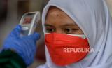 Tenaga kesehatan memeriksa suhu tubuh pelajar sebelum disuntik vaksin Covid-19 di SMAN 113 Jakarta di kawasan Lubang Buaya, Jakarta Timur, Kamis (22/7). Vaksinasi Covid-19 tersebut diperuntukan bagi kalangan pelajar dengan usia 12-17 tahun di wilayah Lubang Buaya, Jakarta Timur, dengan target vaksinasi sebanyak 1.000 orang guna menciptakan kekebalan kelompok sebagai antisipasi penyebaran Covid-19. Republika/Thoudy Badai (FOTO : Republika/Thoudy Badai)
