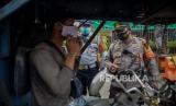 Petugas mengimbau dan memberikan masker kepada pengendara untuk menerapkan prokes..