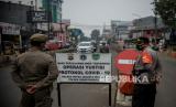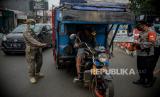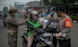 Petugas gabungan melakukan operasi yustisi di kawasan Pasar Minggu, Jakarta, Kamis (22/7). Dalam operasi yustisi tersebut petugas mengimbau sekaligus memberikan masker kepada pengendara untuk menerapkan protokol kesehatan dengan menggunakan masker dua lapis guna mengantisipasi paparan virus Covid-19. (FOTO : Republika/Thoudy Badai)