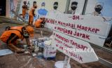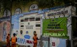 Sejumlah petugas PPSU saat menyelesaikan pembuatan mural di kawasan Cikoko, Cawang, Jakarta, Jumat (23/7). Mural bertemakan Covid-19 tersebut untuk mengajak masyarakat agar tetap waspada akan bahaya Covid-19 dan tetap menerapkan protokol kesehatan. Republika/Putra M. Akbar (FOTO : Republika/Putra M. Akbar)