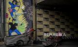 Tuna wisma membawa gerobaknya di dekat mural di kawasan Cikoko, Cawang, Jakarta, Jumat (23/7). Mural bertemakan Covid-19 tersebut untuk mengajak masyarakat agar tetap waspada akan bahaya Covid-19 dan tetap menerapkan protokol kesehatan. Republika/Putra M. Akbar (FOTO : Republika/Putra M. Akbar)