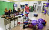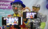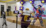 REPUBLIKA.CO.ID, BANDUNG -- Anggota Badut Nyentrik Cimahi Bandung Sauyunan (Necis) Hendayana menghibur anak secara daring saat peringatan Hari Anak Nasional di TK Assalaam, Jalan Sasak Gantung, Kota Bandung, Jumat (23/7).