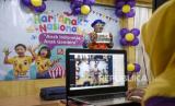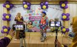 Anggota Badut Nyentrik Cimahi Bandung Sauyunan (Necis) Hendayana bersama guru menghibur anak secara daring saat peringatan Hari Anak Nasional di TK Assalaam, Jalan Sasak Gantung, Kota Bandung, Jumat (23/7). Kegiatan yang digelar dalam rangka memperingati Hari Anak Nasional tersebut bertujuan untuk menghibur sekaligus memberi semangat kepada anak-anak agar tidak jenuh berada di rumah serta mengajak untuk selalu menerapkan protokol kesehatan pencegahan Covid-19. Foto: Republika/Abdan Syakura (FOTO : REPUBLIKA/ABDAN SYAKURA)