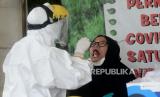 Petugas kesehatan melakukan tes usap PCR Covid-19 kepada warga di Lokasi Swab PCR Puskesmas Kecamatan Gambir, Jakarta, Jumat (23/7). Pemerintah terus menggeber pengetesan dan penelusuran atau testing dan tracing untuk menekan rasio kasus positif di Indonesia. Langkah tersebut dibutuhkan dalam penanganan pandemi Covid-19 saat ini, salah satu langkah yang akan dilakukan adalah dengan memprioritaskan pengetesan bagi suspek dan kontak erat. (FOTO : Prayogi/Republika.)