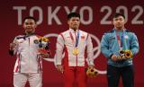 Peraih medali emas Li Fabin dari China (tengah) berdiri bersama peraih medali perak Eko Yuli Irawan dari Indonesia (kiri) dan peraih medali perunggu Igor Son dari Kazakhstan (kanan) setelah kompetisi angkat besi kg putri putra di cabang angkat besi 61kg putra, di Olimpiade Musim Panas 2020, Ahad (25/7), di Tokyo, Jepang. (FOTO : AP/Luca Bruno)