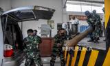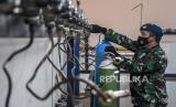 Anggota TNI AU menyemprotkan cairan disinfektan ke tabung oksigen sebelum diisi ulang di Pabrik Zat Asam (Pazam) 731 di Kompleks Lanud Husein Sastranegara, Kota Bandung, Senin (26/7). TNI AU mengoperasikan Pabrik Zat Asam (Pazam) 731 di bawah Komando Pemeliharaan Materiil (Koharmat) Angkatan Udara. Pazam 731 tersebut mampu melakukan pengisian 60 hingga 70 tabung oksigen per hari untuk membantu memenuhi kebutuhan tabung oksigen di rumah sakit dalam penanganan Covid-19 di wilayah Bandung Raya. Foto: Republika/Abdan Syakura (FOTO : REPUBLIKA/ABDAN SYAKURA)
