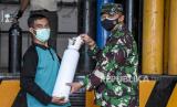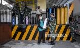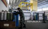 REPUBLIKA.CO.ID,BANDUNG -- Anggota TNI AU melakukan pengisian ulang tabung oksigen di Pabrik Zat Asam (Pazam) 731 di Kompleks Lanud Husein Sastranegara, Kota Bandung, Senin (26/7).