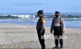 Polisi berjaga di kawasan wisata Pantai Legian di Badung, Bali, Senin (26/7/2021). Pemprov Bali masih menutup untuk sementara berbagai destinasi pariwisata di Pulau Bali dari kunjungan wisatawan pada perpanjangan Pemberlakuan Pembatasan Kegiatan Masyarakat (PPKM) Level 4 untuk menekan penyebaran COVID-19. (FOTO : Antara/Fikri Yusuf)