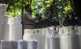 Anggota Kepolisian berada di dekat tabung oksigen saat penyerahan barang bukti tabung oksigen hasil pengungkapan kasus tindak kejahatan di Jakarta, Selasa (27/7). Sebanyak 138 tabung yang sudah dilakukan pemeriksaan oleh Kementerian Kesehatan itu diserahkan kepada Pemerintah Provinsi DKI Jakarta untuk digunakan sebagai penanggulangan Covid-19 di sejumlah fasilitas pelayanan kesehatan di Jakarta. Republika/Putra M. Akbar (FOTO : Republika/Putra M. Akbar)