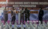 Gubernur DKI Jakarta Anies Baswedan (ketiga kiri) bersama Kapolda Metro Jaya Irjen Pol M. Fadil Imran (kedua kiri) dan Pangdam Jaya Mayjen TNI Mulyo Aji (ketiga kanan) melihat barang bukti tabung oksigen hasil pengungkapan kasus tindak kejahatan di Jakarta, Selasa (27/7). Sebanyak 138 tabung yang sudah dilakukan pemeriksaan oleh Kementerian Kesehatan itu diserahkan kepada Pemerintah Provinsi DKI Jakarta untuk digunakan sebagai penanggulangan Covid-19 di sejumlah fasilitas pelayanan kesehatan di Jakarta. (FOTO : Republika/Putra M. Akbar)