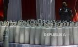 Petugas berjalan di dekat tabung oksigen saat penyerahan barang bukti tabung oksigen hasil pengungkapan kasus tindak kejahatan di Jakarta, Selasa (27/7). Sebanyak 138 tabung yang sudah dilakukan pemeriksaan oleh Kementerian Kesehatan itu diserahkan kepada Pemerintah Provinsi DKI Jakarta untuk digunakan sebagai penanggulangan Covid-19 di sejumlah fasilitas pelayanan kesehatan di Jakarta. Republika/Putra M. Akbar (FOTO : Republika/Putra M. Akbar)