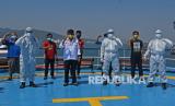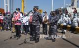 REPUBLIKA.CO.ID, MERAK -- Menteri Perhubungan Budi Karya Sumardi (kiri) bersama Kepala Staf TNI Angkatan Laut Laksama Yudo Margono (kedua kiri) melepas para tenaga kesehatan Korps Marinir TNI AL saat acara Serbuan Vaksinasi COVID-19 Ship To Ship di Pelabuhan Merak, Banten, Selasa (27/7/2021).