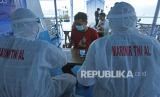 Tenaga kesehatan Korps Marinir TNI AL memeriksa kesehatan ABK di atas KMP Sebuku saat acara Serbuan Vaksinasi COVID-19 Ship To Ship di Selat Sunda, Banten, Selasa (27/7/2021). Panitia menyediakan 1.500 dosis vaksin COVID-19 untuk anak buah kapal (ABK), nelayan, dan warga pesisir guna mempercepat pencapaian Imunitas Komunal (Herd Immunity) dan mengatasi pandemi COVID-19 di Indonesia.  (FOTO : Antara/Asep Fathulrahman)