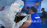 Tenaga kesehatan Korps Marinir TNI AL menyuntikan vaksin COVID-19 kepada ABK di atas KMP Sebuku saat acara Serbuan Vaksinasi COVID-19 Ship To Ship di Selat Sunda, Banten, Selasa (27/7/2021). Panitia menyediakan 1.500 dosis vaksin COVID-19 untuk anak buah kapal (ABK), nelayan, dan warga pesisir guna mempercepat pencapaian Imunitas Komunal (Herd Immunity) dan mengatasi pandemi COVID-19 di Indonesia.  (FOTO : Antara/Asep Fathulrahman)