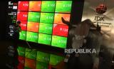 REPUBLIKA.CO.ID,JAKARTA -- Seorang petugas kebersihan melintasi layar digital pergerakan saham di Jakarta, Rabu (28/7/2021).