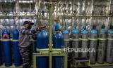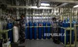 REPUBLIKA.CO.ID, SEMARANG -- Kru KRI dr Soeharso SHS-990 mengisi tabung oksigen di kapal tersebut saat bersandar di Pelabuhan Tanjung Emas, Semarang, Jawa Tengah, Rabu (28/7/2021). Kapal bantu rumah sakit TNI AL di bawah jajaran Satuan Kapal Bantu Koarmada II yang memiliki generator oksigen dengan kemampuan produksi pengisian tabung oksigen ukuran 6.000 liter hingga 20-25 tabung dan ukuran 1.500 liter hingga 65 tabung per 24 jam itu disiagakan guna memasok kebutuhan oksigen pasien COVID-19 di Jawa Tengah terutama di Kota Semarang.