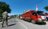 Sejumlah truk mengangkut beras bersiap saat peluncuran bantuan sosial beras di Kota Gorontalo, Gorontalo, Rabu (28/7/2021). Perum Bulog Sub Divre Gorontalo menyiapkan 146 ton beras program Kementerian Sosial yang akan diserahkan kepada 14.653 Keluarga Penerima Manfaat (KPM) terdampak Pemberlakukan Pembatasan Kegiatan Masyarakat (PPKM) di daerah itu. (FOTO : ANTARA/Adiwinata Solihin)