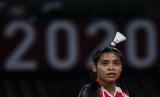 REPUBLIKA.CO.ID,TOKYO -- Pebulutangkis tunggal putri Indonesia Gregoria Mariska Tunjung bersiap melakukan servis ke arah tunggal putri Thailand Ratchanok Intanon dalam perempat final Olimpiade Tokyo 2020 di Musashino Forest Sport Plaza, Tokyo, Jepang, Kamis (29/7/2021).