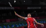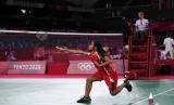 Pebulutangkis tunggal putri Indonesia Gregoria Mariska Tunjung memukul kok ke arah tunggal putri Thailand Ratchanok Intanon dalam perempat final Olimpiade Tokyo 2020 di Musashino Forest Sport Plaza, Tokyo, Jepang, Kamis (29/7/2021). Gregoria gagal melaju ke perempat final setelah kalah 12-21, 19-21 dari Ratchanok Intanon (FOTO : ANTARA/Sigid Kurniawan)