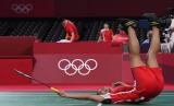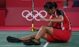 Pebulutangkis tunggal putri Indonesia Gregoria Mariska Tunjung terjatuh usai gagal mengejar kok dari tunggal putri Thailand Ratchanok Intanon dalam perempat final Olimpiade Tokyo 2020 di Musashino Forest Sport Plaza, Tokyo, Jepang, Kamis (29/7/2021). Gregoria gagal melaju ke perempat final setelah kalah 12-21, 19-21 dari Ratchanok Intanon (FOTO : ANTARA/Sigid Kurniawan)
