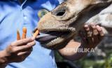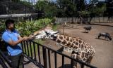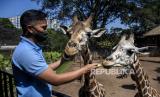 Petugas memberi pakan jerapah (Giraffa) di kandang Bandung Zoological Garden, Kota Bandung, Kamis (29/7). Pengelola Bandung Zoological Garden berencana menerapkan sistem sehari makan sehari tidak bagi 850 satwa koleksi serta memberi pakan satwa karnivora dengan memotong satwa herbivora guna menyelamatkan satwa dari kelaparan. Hal tersebut imbas dari minimnya pemasukan akibat tidak beroperasinya objek wisata tersebut karena penerapan Pemberlakuan Pembatasan Kegiatan Masyarakat (PPKM) Level 4. Foto: Republika/Abdan Syakura (FOTO : REPUBLIKA/ABDAN SYAKURA)