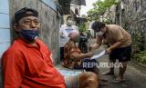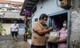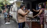 Pengurus RT memberikan beras kepada warga di kawasan Tanah Tinggi, Johar Baru, Jakarta, Kamis (29/7). Dinas Sosial DKI Jakarta kembali mendistribusikan Bantuan Sosial Non Tunai (BSNT) berupa beras untuk 1.007.379 Keluarga Penerima Manfaat (KPM) yang tersebar di lima wilayah kota Administrasi dan Kepulauan Seribu. Republika/Putra M. Akbar (FOTO : Republika/Putra M. Akbar)