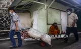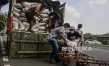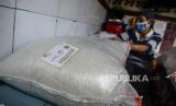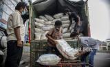 Pengurus RT memindahkan beras yang siap disalurkan kepada warga di kawasan Tanah Tinggi, Johar Baru, Jakarta, Kamis (29/7). Dinas Sosial DKI Jakarta kembali mendistribusikan Bantuan Sosial Non Tunai (BSNT) berupa beras untuk 1.007.379 Keluarga Penerima Manfaat (KPM) yang tersebar di lima wilayah kota Administrasi dan Kepulauan Seribu. (FOTO : Republika/Putra M. Akbar)
