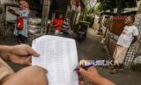 Pengurus RT meminta tanda tangan warga penerima Bantuan Sosial Non Tunai (BSNT) di kawasan Tanah Tinggi, Johar Baru, Jakarta, Kamis (29/7). Dinas Sosial DKI Jakarta kembali mendistribusikan BSNT berupa beras untuk 1.007.379 Keluarga Penerima Manfaat (KPM) yang tersebar di lima wilayah kota Administrasi dan Kepulauan Seribu. Republika/Putra M. Akbar (FOTO : Republika/Putra M. Akbar)