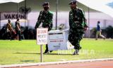Anggota TNI membawa vaksin saat Serbuan Vaksinasi COVID-19 di lapangan thor Gelora Pancasila Surabaya, Jawa Timur, Kamis (29/7/2021). Komando Armada (Koarmada) II bersama Pemerintah kota Surabaya melakukan vaksinasi COVID-19 sebanyak 25.000 dosis untuk masyarakat Surabaya guna mewujudkan kekebalan komunal atau erd immunity menuju Indonesia sehat.  (FOTO : Antara/Umarul Faruq)
