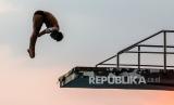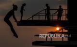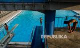 REPUBLIKA.CO.ID, BANDUNG -- Siluet sejumlah atlet loncat indah Jabar saat berlatih di Kolam Renang FPOK UPI, Bandung, Jawa Barat, Kamis (29/7/2021). Tim loncat indah Jabar menggenjot porsi latihan sebagai persiapan untuk mencapai target emas bagi atlet putri dan perak atau perunggu untuk atlet putra pada PON XX/2020 Papua mendatang.