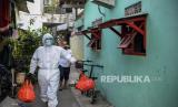 REPUBLIKA.CO.ID,JAKARTA -- Pengurus ranting Nahdlatul Ulama Kelurahan Cipedak mengantarkan makanan untuk warga di kawasan Cipedak, Jakarta, Jumat (30/7).