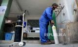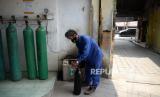 Pekerja melakukan pengisian tabung oksigen gratis untuk masyarakat di UD Berkah Oksigen, Depok, Jawa Barat, Jumat (30/7). Yayasan Khadimul Ummah Madani bekerja sama dengan UD Berkah Oksigen menyelenggarakan pengisian ulang tabung oksigen gratis setiap hari jumat pukul 08.30 WIB hingga 17.00 WIB untuk wilayah Kota Depok. Prayogi/Republika (FOTO : Prayogi/Republika.)