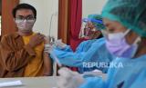 REPUBLIKA.CO.ID, DENPASAR -- Vaksinator menyuntikkan vaksin COVID-19 kepada mahasiswa di Institut Seni Indonesia (ISI) Denpasar, Bali, Jumat (30/7/2021). Hingga Kamis (29/7) sebanyak 3.055.817 orang di Provinsi Bali telah menerima vaksin COVID-19 dosis pertama atau mencapai 101,99 persen dari target sasaran 2.996.060 orang. ANTARA FOTO/Fikri Yusuf/