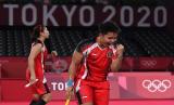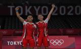 REPUBLIKA.CO.ID,TOKYO -- Pebulutangkis ganda putri Indonesia Greysia Pollii/Apriyani Rahayu merayakan kemenangan atas ganda putri Korea Selatan Lee Sohee/Shin Seungchan dalam semifinal Olimpiade Tokyo 2020 di Musashino Forest Sport Plaza, Tokyo, Jepang, Sabtu (31/7/2021). Greysia/Apriyani menang 21-19, 21-17 dan melaju ke final.