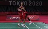 Pebulutangkis ganda putri Indonesia Greysia Pollii/Apriyani Rahayu merayakan kemenangan atas ganda putri Korea Selatan Lee Sohee/Shin Seungchan dalam semifinal Olimpiade Tokyo 2020 di Musashino Forest Sport Plaza, Tokyo, Jepang, Sabtu (31/7/2021). Greysia/Apriyani menang 21-19, 21-17 dan melaju ke final.  (FOTO : Antara/Sigid Kurniawan)