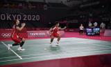 Pebulutangkis ganda putri Indonesia Greysia Pollii/Apriyani Rahayu mengembalikan kok ke arah ganda putri Korea Selatan Lee Sohee/Shin Seungchan dalam semifinal Olimpiade Tokyo 2020 di Musashino Forest Sport Plaza, Tokyo, Jepang, Sabtu (31/7/2021). Greysia/Apriyani menang 21-19, 21-17 dan melaju ke final.  (FOTO : Antara/Sigid Kurniawan)