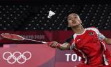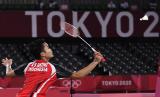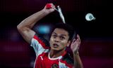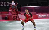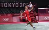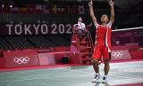 REPUBLIKA.CO.ID,TOKYO -- Pebulutangkis tunggal putra Indonesia Anthony Sinisuka Ginting melakukan selebrasi seusai mengalahkan tunggal putra Denmark Anders Antonsen dalam perempatfinal Olimpiade Tokyo 2020 di Musashino Forest Sport Plaza, Tokyo, Jepang, Sabtu (31/7/2021).