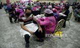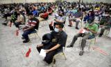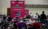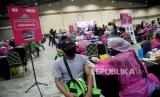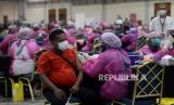Sejumlah peserta menunggu gilirn untuk di vaksin COVID-19 di Sentra Vaksin, JCC Senayan, Jakarta, Sabtu (31/7). GoTix bekerja sama dengan Polda Metro Jaya membuat sentra vaksinasi Covid-19 bagi para warga yang berusia mulai dari 12 tahun ke atas dalam rangka mendukung program percepatan vaksinasi pemerintah.Prayogi/Republika. (FOTO : Prayogi/Republika.)