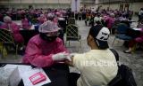 Petugas medis menyuntikkan vaksin COVID-19 kepada warga di Sentra Vaksin, JCC Senayan, Jakarta, Sabtu (31/7). GoTix bekerja sama dengan Polda Metro Jaya membuat sentra vaksinasi Covid-19 bagi para warga yang berusia mulai dari 12 tahun ke atas dalam rangka mendukung program percepatan vaksinasi pemerintah.Prayogi/Republika. (FOTO : Prayogi/Republika.)
