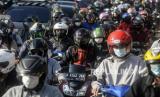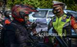 Pengendara motor memperlihatkan surat tugas saat dilakukan penyekatan di Jalan Raya Margonda, Depok, Jawa Barat, Senin (2/8). Pada hari terakhir Pemberlakuan Pembatasan Kegiatan Masyarakat (PPKM) Level 4, mobilitas warga yang akan menuju Jakarta cenderung meningkat hingga menimbulkan kemacetan mencapai satu kilometer. Republika/Putra M. Akbar (FOTO : Republika/Putra M. Akbar)
