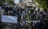 Anggota TNI mengatur lalu lintas saat dilakukan penyekatan di Jalan Raya Margonda, Depok, Jawa Barat, Senin (2/8). Pada hari terakhir Pemberlakuan Pembatasan Kegiatan Masyarakat (PPKM) Level 4, mobilitas warga yang akan menuju Jakarta cenderung meningkat hingga menimbulkan kemacetan mencapai satu kilometer. Republika/Putra M. Akbar (FOTO : Republika/Putra M. Akbar)