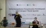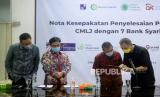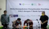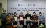 Chief Corporate Banking Bank Muamalat Irvan Yulian Noor (dua kiri) bersama Direktur Utama PT Citra Marga Lintas Jabar (CMLJ) Muhdhor Nurohman (dua kanan) menandatangani akad kesepakatan penyelesaian pembiayaan antara CMLJ dengan 7 Bank Syariah disaksikan oleh Direktur Utama Bank Muamalat Achmad K. Permana (kiri) dan Pengusaha sekaligus pemilik PT Citra Marga Lintas Jabar (CMLJ) Jusuf Hamka (kanan) di Kantor DSN MUI, Jakarta, Senin (2/8). (FOTO : Prayogi/Republika.)