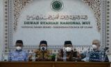 Ketua Badan Pelaksana Harian DSN-MUI KH. Hasanudin (dua kiri) memberikan sambutan pada acara penandatanganan akad kesepakatan penyelesaian pembiayaan antara CMLJ dengan 7 Bank Syariah di Kantor DSN MUI, Jakarta, Senin (2/8). Penandatangan akad kesepakatan ini mengakhiri kesalahpahaman yang terjadi antara kedua belah selama ini. (FOTO : Prayogi/Republika.)